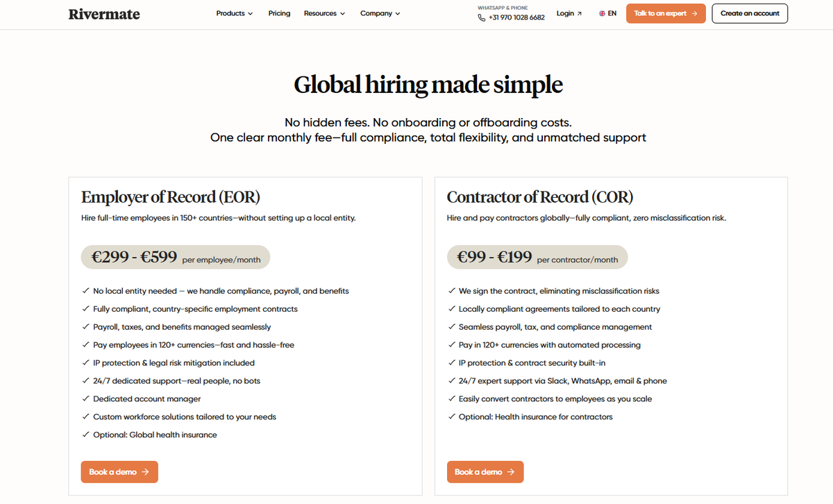 Vorhersehbare Preise: Rivermate’s transparente Preisgestaltung sorgt dafür, dass keine versteckten Gebühren oder unerwartete Kosten entstehen. Mit All-inclusive-Preisen, die Gehaltsabrechnung, Steuern, Compliance und Benefits abdecken, können Unternehmen Budgets genau planen und unerwartete Ausgaben vermeiden (Quelle)