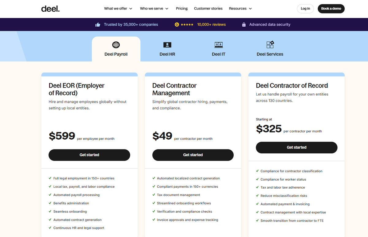 Deel ist bekannt für seine Fähigkeit, Contractors und Mitarbeitende schnell in über 150 Ländern zu onboarden. Die Plattform mit Automatisierungsfokus überzeugt bei der Abwicklung globaler Zahlungen, Vertragsmanagement und Compliance, was sie zur Top-Wahl für Unternehmen macht, die eine schnelle, skalierbare Lösung suchen.