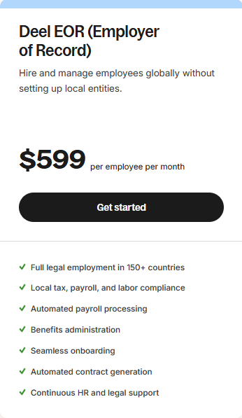 Deel ist ein führender globaler EOR-Anbieter, bekannt für seine Einfachheit und Skalierbarkeit, der Lösungen für Hiring, Gehaltsabrechnung und Compliance-Management in über 150 Ländern anbietet. Deel ermöglicht es Unternehmen, Vollzeitmitarbeiter oder Contractors zu rekrutieren, wobei die lokale Compliance für sie übernommen wird, sodass Unternehmen global expandieren können, ohne lokale Einheiten zu benötigen.
