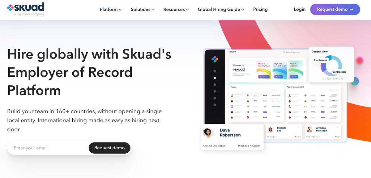 Skuad es frecuentemente elegida por equipos que quieren cobertura en muchos países y una configuración simple. Ideal para empresas que necesitan una forma sencilla de contratar internacionalmente.