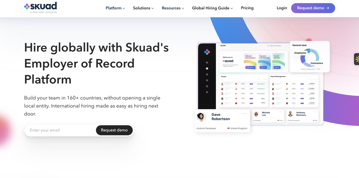Skuad offre una soluzione EOR economica con flussi di lavoro semplici e copertura di conformità adatta a aziende in fase iniziale che assumono a livello internazionale.